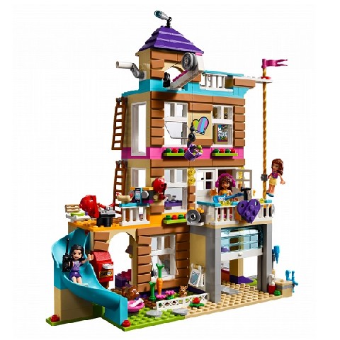 Friendship House LEGO Friends "Дом дружбы" Трехэтажное здание представляет собой штаб-квартиру подружек. Её можно назвать сказочной, ведь здесь есть всё, о чём мечтает любая девчонка! Она создана в различных цветах, но преобладающим оттенком является коричневый. На улице высажена грядка. Выращенными овощами могут питаться и девочки, и кролик Твистер. На крыше дома располагается джакузи. В нём можно не только плескаться, но и наблюдать отсюда за окружающим миром. Одна из комнат – это творческая мастерская Эммы. Здесь девчонки будут любоваться её картинами или пробовать создавать неповторимые авторские творения. Остальные помещения – это уютная спальня и удобная кухня. Проводя время за просмотром телевизора или за чашечкой чая, подруги услышали сигнал тревоги? Это значит, что пора применять все свои шпионские навыки! Разворачивая телевизор, они увидят секретный экран. Быстро спуститься вниз можно с помощью горки, пожарной лестницы или каната, а уехать прочь – на гоночном велосипеде. Количество деталей: 722 Рекомендуемый возраст: 6 - 12 лет