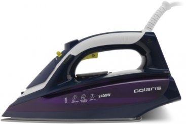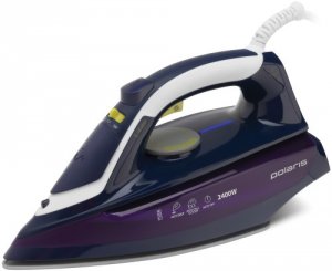 Утюг Polaris PIR 2480AK мощность 2400 Вт керамическая подошва постоянная подача пара, вертикальное отпаривание, паровой удар, автоматическое отключение, система самоочистки, противокапельная система мощность подачи пара до 45 г/мин вес 1.21 кг