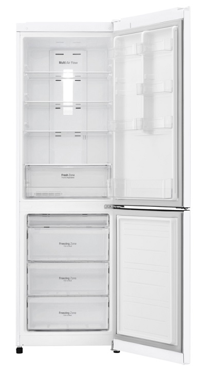 Холодильник с нижней морозильной камерой LG GA-B419SQGL White Размораживание хол. камеры: No Frost Размораживание мор. камеры: No Frost Тип управления: Сенсорное Общий полезный объем, л: 302 Объем холодильной камеры, л: 223 Объем морозильной камеры, л: 79 Класс энергопотребления: A+ Энергопотребление в год, КВт: 277 Габариты (ВxШxГ), мм: 1907x595x655