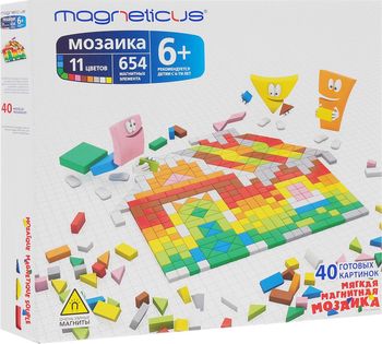 Magneticus Set creatie "Mozaic" 654 el Magneticus Hабор "Магнитная мозаика" 654 эл. Польза от этой магнитной мозаики очевидна, ведь в процессе ее собирания дети не только учатся соотносить образец и свое творение, но и значительно развивают мелкую моторику рук. А такое обилие цветов и геометрических форм элементов позволит крохе в полной мере проявить свои творческие способности и фантазию при создании красочных изображений из магнитных деталей комплекта. Дети смогут соединять элементы друг с другом, получая в итоге мозаику с красочными изображениями: рыцаря, хоккеист и другие (всего 40 вариантов). Количество деталей: 654 шт. В комплекте: детали мозаики, игровое поле, образцы картинок (40 шт), коробка. Рекомендуемый возраст: 6 лет +