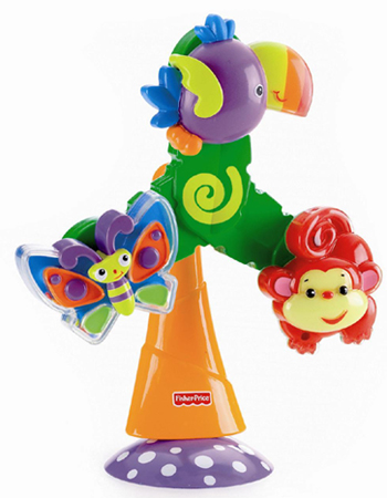 FP Palmierul Vesel Fisher-Price Волшебная мельница "Тропический лес" Игрушка погремушка для новорожденных порадует малыша. Игрушка прикрепляется к ровной поверхности при помощи присоски. Когда малыш играет с погремушкой, то лопасти пропеллера с изображенными на них игрушками вращаются. Погремушка в виде мельницы с тремя персонажами: бабочка, обезьянка, птичка тукан. Для детей от 3-x месяцев.