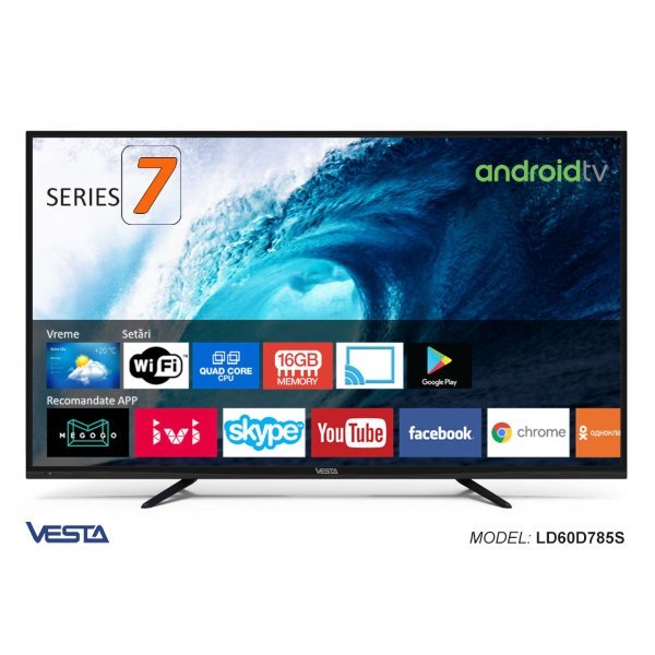 Телевизор Vesta LD60D785S 4K Тип LED-телевизор Система AndroidTV 7.1 Google Play Market Диагональ 60" (150 см) 4K Разрешение 3840x2160 Цифровой тюнер DVB-T/T2/C(Ci+) Видеообзор настройки бесплатных цифровых каналов USB 3.0 (Поддерживает все популярные форматы)