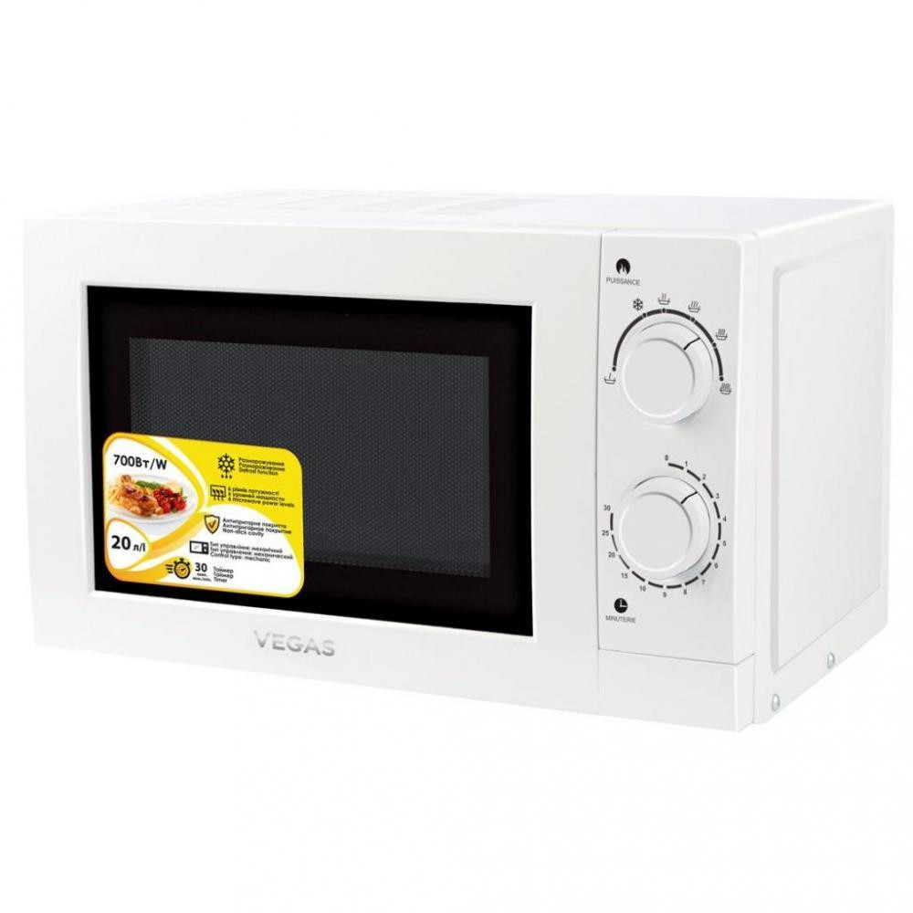 Микроволновая печь Vegas VMO-1920SL Тип СВЧ соло Тип управления механическое Объем 20 л Диаметр поворотного стола 24.5 см Открывание дверцы ручка Мощность микроволн 700 ВтМикроволновая печь Vegas VMO-1920SL