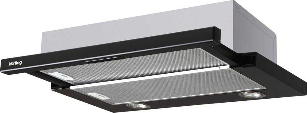 Вытяжка Korting KHP6313N выдвижная, встраивается в навесной шкафчик отвод / циркуляция макс. производительность 600 куб. м/ч ширина для установки 60 см 2 двигателя для максимальной производительности мощность 250 Вт механическое управление тихий двигатель