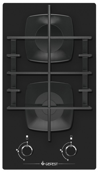 Газовая варочная панель Gefest ПВГ 2003 поверхность из закаленного стекла 2 конфорки независимая установка электроподжиг газ-контроль чугунные решетки поворотные переключатели ШхГ: 30х53 смГазовая варочная панель Gefest ПВГ 2003