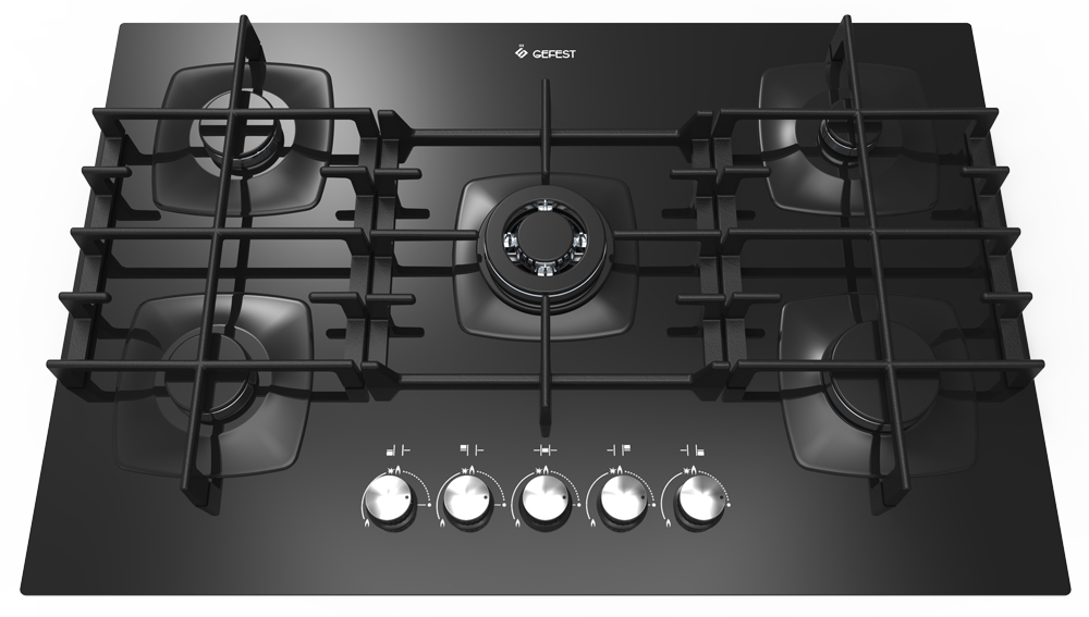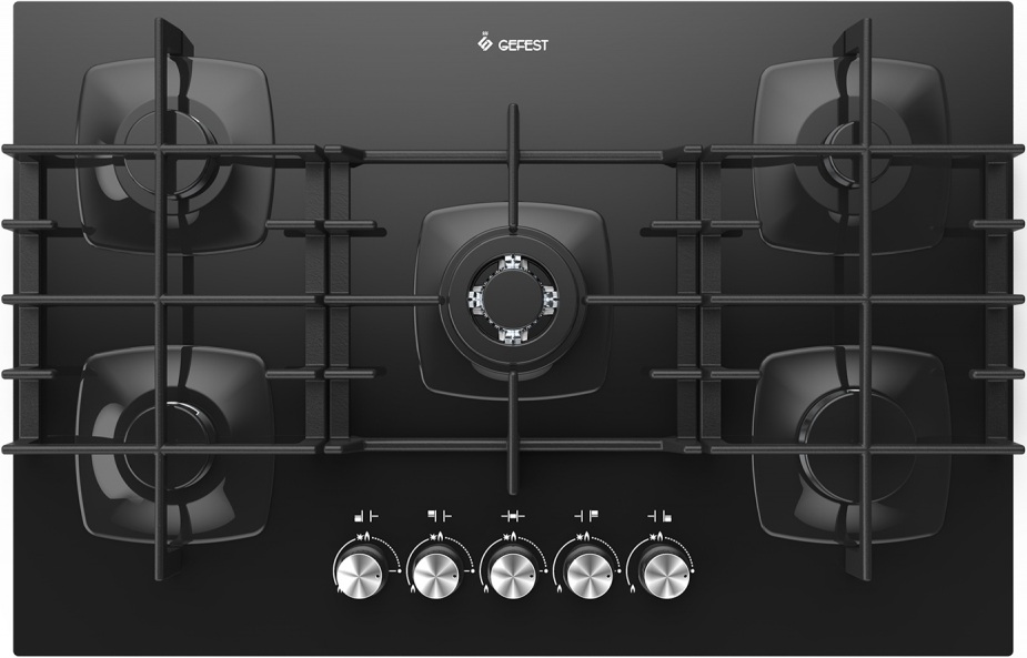 Газовая варочная панель Gefest CH 2340 поверхность из закаленного стекла 5 конфорок независимая установка электроподжиг газ-контроль чугунные решетки поворотные переключатели ШхГ: 80х52.50 см