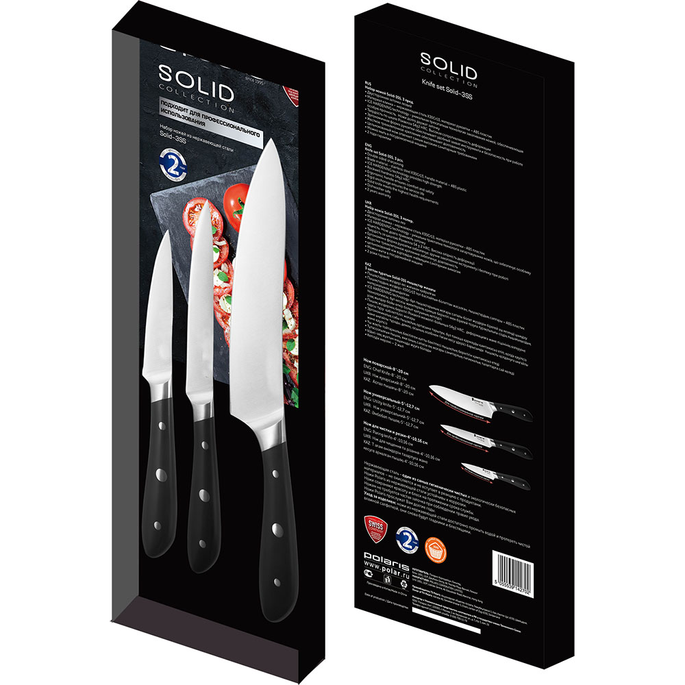 Набор ножей Polaris Solid-3SS (3buc) Двусторонняя заточка лезвий. Материал клинка - нержавеющая сталь X30Cr13. Материал рукоятки - ABS пластик. ICE HARDENING technology - уникальная трехэтапная технология закаливания ножей, обеспечивающая особую прочность. Ножи долго держат заточку. Твердость по шкале Роквелла 54± 2HRC. Высокая сопротивляемость деформации. Эргономичная форма рукоятки обеспечивает удобный захват инструмента и безопасность при работе. Жесткое трехклепочное крепление обеспечивает долговечность. Цельнокованый нож отвечает самым высоким санитарным требованиям. Можно мыть в посудомоечной машине. Нож поварской - 8'' - 20 см. Нож универсальный - 5'' - 12.7 см. Нож для чистки и резки - 4" - 10.16 см. Изделие Набор ножей, 3 предмета Материал Нержавеющая сталь Ручки материал рукоятки ABS пластик