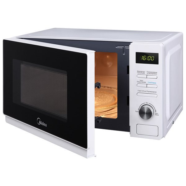 Микроволновая печь Midea AG720C4E-W объем 20 л мощность 700 Вт гриль внутреннее покрытие камеры: эмаль кнопочные, поворотные тактовые переключатели дисплей защита от детейМикроволновая печь Midea AG 720C4E-W
