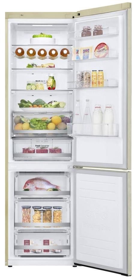 Холодильник LG GA-B509SEDZ Размораживание хол. камеры No Frost Размораживание мор. камеры No Frost Количество камер 2 Количество дверей 2 Антибактериальное покрытие да Компрессор Тип компрессора инверторный Количество компрессоров 1 Хладогент R600a Дисплей да Тип управления сенсорный Общий полезный объем, л 384 Объем холодильной камеры, л 277 Объем морозильной камеры, л 107 Количество ящиков морозилки 3 Тип подсветки LED Освещение холодильной камеры да Мощность замораживания, кг в сутки 12 Климатческий класс SN, ST Автономное сохранение холода, ч 16 Звуковая сигнализация открытой двери да Уровень шума, дБ 36 Материал полок стекло Перенавешиваемые двери да Управление со смартфона Управление Smart Diagnostics Тип подключения Wi-Fi Технология Smart Diagnostics Энергопотребление в год, КВт 275 Высота, см 203 Ширина, см 60 Глубина, см 68 Вес, кг 77 Вес в упаковке, кг 80 Цвет бежевый Доп. особенности Total No Frost Страна производства Россия Производитель LG