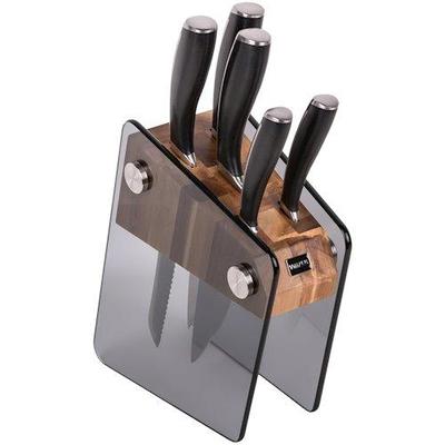 Set de cutite Vinzer Crystal 89113 Количество предметов 6 Материал лезвия сталь Материал рукоятки бакелит Материал подставки дерево, стекло Нож поварской 1 Нож хлебный 1 Нож универсальный 1 Нож для овощей 1 Нож для мяса 1 Производитель Vinzer