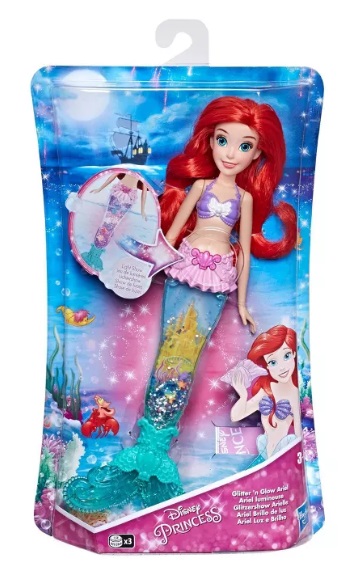 DPR GLITTER N GLOW ARIEL Кукла Принцессы Дисней "Интерактивная Ариэль" Кукла диснеевской принцессы Ариэль Glitter and Glow с подсветкой позволит вам оживить в воображении магию мультфильма "Русалочка". В хвосте куклы переливается вода, в которой плавают сияющие блестки, морские звезды и ракушки, достаточно лишь наклонить куклу! Kнопка, расположенная на поясе куклы, предназначена для активации 3 различных режимов подсветки; при нажатии на кнопку хвост изменит цвет сияния или включит подсветку; после 20 секунд бездействия кукла переходит в режим сна для экономии заряда батареек; с куклой безопасно играть в воде. В комплекте: 1 кукла, инструкции Для работы необходимы 3 батарейки типа A76 (входят в комплект). Для детей: от 3-x лет
