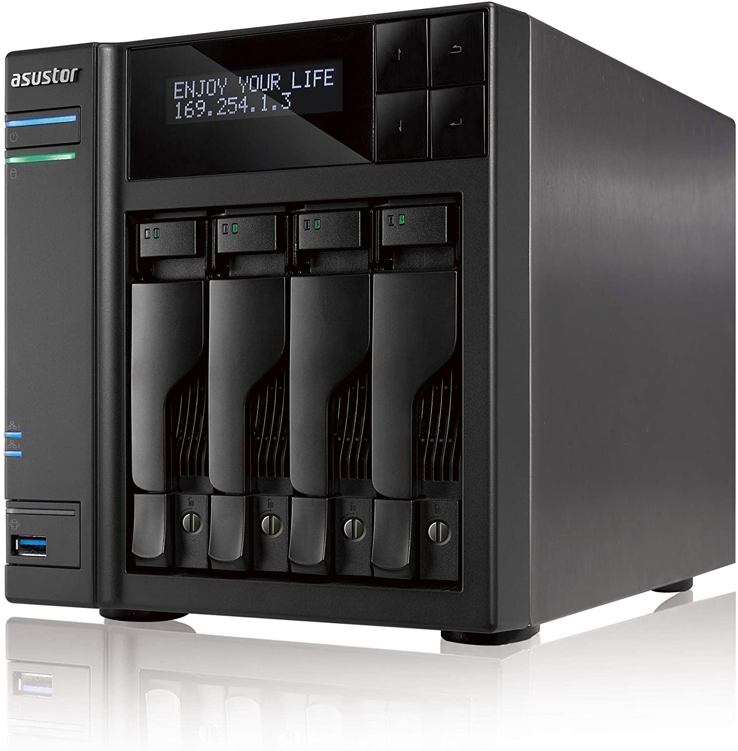4-bay NAS Server ASUSTOR "AS7004T", Intel Core i5-4590S (Quad-Core) 3.0-3.7GHz, 8GB DDR3L(Max.16GB), 4x 2.5"/3.5"SATA (Hot Swap), LCD Panel, USB3.0 x3, USB2.0 x2, eSATA x2, GigaLAN x2, HDMI, S/PDIF, AES-NI, HT, IR, IP cam: <64 (4 Free)