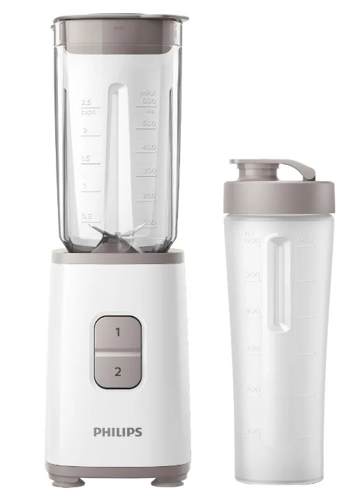 Блендер PHILIPS HR2602/00, 350W power output, mixing bowl 0.6l, plastic, glass 0.7l, white максимальная мощность: 350 Вт механическое управление емкость кувшина 0.6 л корпус из пластика кувшин пластиковый дорожная бутылка в комплекте