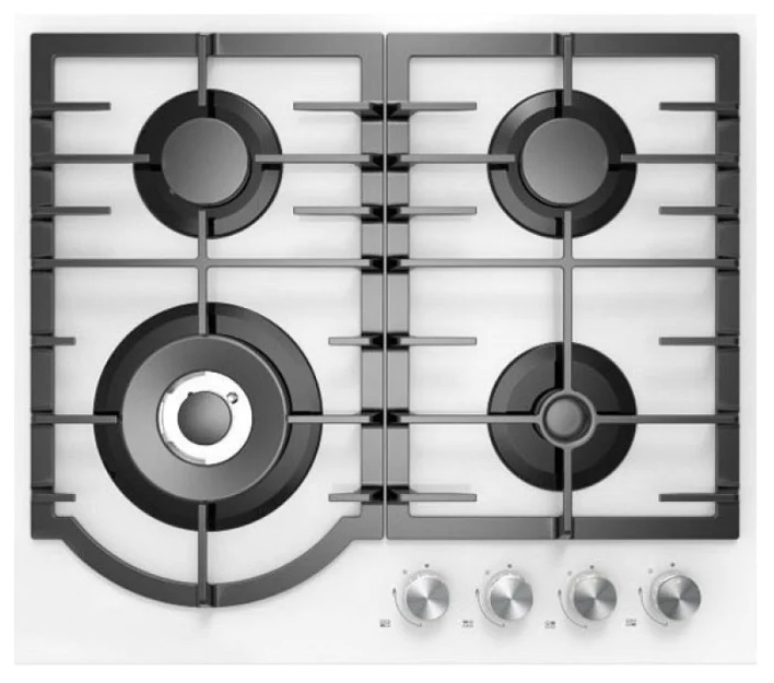 варочная панель газовая MG696VGW Midea поверхность из закаленного стекла 4 конфорки независимая установка электроподжиг газ-контроль чугунные решетки поворотные переключатели ШхГ: 59х51 смварочная панель газовая MG696VGW Midea