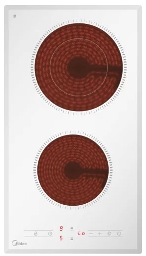 варочная панель электрическая MCH32329FW Midea стеклокерамическая поверхность 2 конфорки независимая установка защита от детей сенсорные переключатели кнопочное управление индикатор остаточного тепла ШхГ: 28.80х52 см