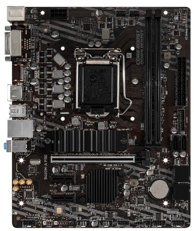 Материнская плата MSI B460M-PRO, Socket 1200, Intel® B460 (10th Gen CPU), Dual 2xDDR4-2933, CPU Intel graphics, VGA, DVI, HDMI, 1xPCIe X16, 6xSATA3, RAID, 1xM.2 slot, 2xPCIeX1, ALC892 HDA, 1xGbE LAN, 6xUSB3.2, RGB Led, mATX форм-фактор: microATX сокет: LGA1200 2 слота DDR4 DIMM, 2133-2933 МГц 1 слот M.2 PCI-E/SATA 3.0 1 слот PCI-E x16 игровая разъемы на задней панели: HDMI, DVI звуковая схема 7.1