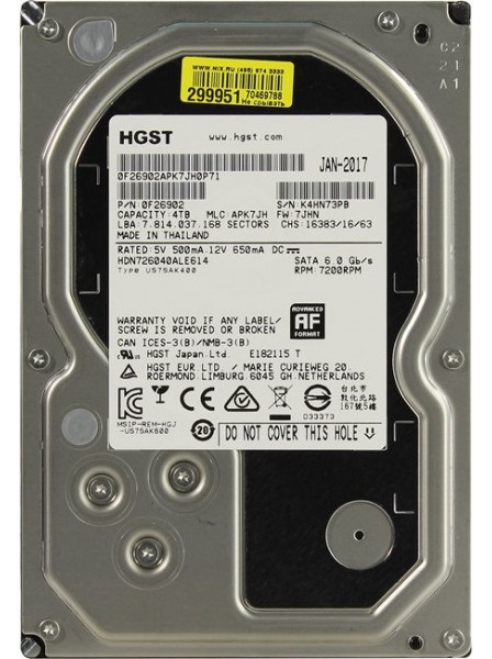 3.5" HDD 4.0TB Hitachi Deskstar NAS 7K6000, 7200rpm, 128MB, SATAIII (HDN726040ALE614), FR Бренд Hitachi Модель Deskstar NAS 7K6000 (HDN726040ALE614) Назначение для настольных ПК Форм-фактор накопителя 3,5" Память накопителя 4.0 ТБ Скорость вращения шпинделя 7200 об./мин. Буфер 128 МБ