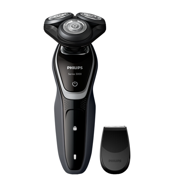 Shaver Philips S5110/06, rotary electric shaver, rechargeable battery operation Li-Ion (operating time 40 minutes, charging time 1 hours), dry shave, 3 shaving heads, automatic voltage adjustment 100-240V, protection cap, black роторная система бритья сухое бритье 3 бритвенные головки работает от сети и в автономном режиме время автономной работы до 40 мин триммер