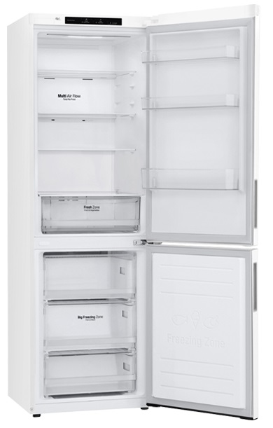 Холодильник LG GA-B459CQCL Общий полезный объём: 341 l Объём морозильной камеры: 107 l Объём холодильной камеры: 234 l Автономное сохранение холода: 16 h Мощность замораживания в сутки: 12 kg Размораживание морозильной камеры: No Frost Размораживание холодильной камеры: No Frost Энергопотребление в год: 309 kWh Наличие дисплея: Da Тип дисплея: LED Бренд: LG Класс Энергопотребления: A+ Количество компрессоров: 1 Количество отделений в морозильной камере: 3 Количество отделений в холодильной камере: 4 Материал полок: Sticla Открытие дверцы: Dreapta Расположение морозильной камеры: Jos Система охлаждения: Total No Frost Тип: 2 camere Тип компрессора: Invertor Уровень шума: 36 dB Хладогент: R600a Особенности: DoorCooling+ Technology, Smart Diagnosis Перевешиваемые двери: Да Тип установки: Standard Вес: 68 kg Размеры в упаковке (ШxВxГ): 649 x 1961 x 787 mm Ширина (мм): 595 Высота (мм): 1860 Глубина (мм): 682 Цвет: Белый
