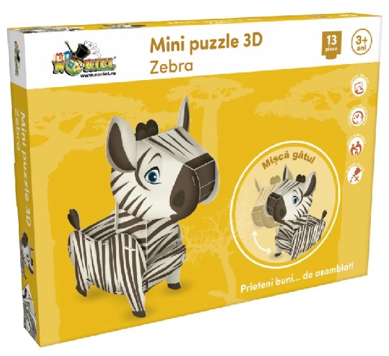 Mini Puzzle 3D Zebra Мини пазл 3D "Зебра" 13 детелей Испытайте свое творчество, интеллект и мировоззрение, собрав веселых и реалистичных животных! Внимательно объединив все детали, Вы создайте своего любимого животного, которого можно разместить в своей комнате. Не забывайте: каждое животное индивидуальное и двигается по разному. Из той же коллекции Вы встретите: Кенгуру, Жирафа и Крокодила. B наборе 13 деталей Рекомендуемый возраст: 3 года +