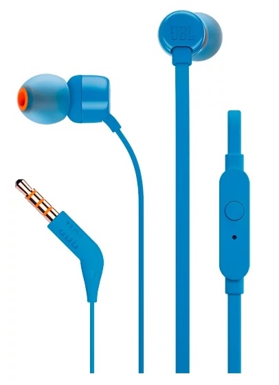 JBL T110 / In-ear headphones with microphone, Dynamic driver 9 mm, Frequency response 20 Hz-20 kHz, 1-button remote with microphone, JBL Pure Bass sound, Tangle-free flat cable, 3.5 mm jack, Blue конструкция: внутриканальные (закрытые) тип излучателей: динамические микрофон: да импеданс: 16 Ом диапазон воспроизводимых частот: 20-20000 Гц чувствительность: 100 дБ разъем: mini jack 3.5 mm длина кабеля: 1.2 м вес: 13 г