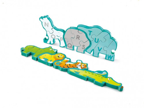 HAPE-ALPHABET&ANIMAL PARADE E1627A Пару слов о HAPE E1627A Пазлы, Алфавит и парад животных Особенности: Материал- деревянные пазлы Количество штук: 26 частей, Данные пазлы красиво и оригинально сделанны, с дикими животными на одной стороне и алфавитом на другой. Головоломка может стоять на столе. Для детей от трех лет.