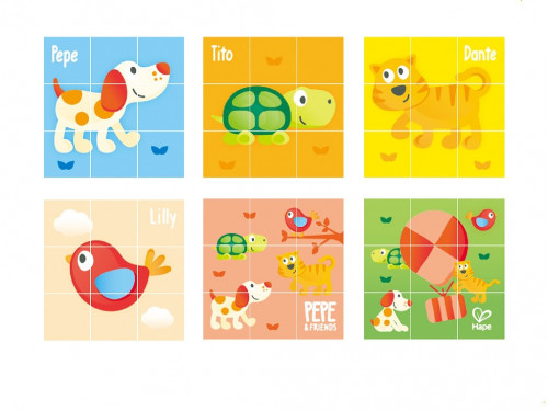 HAPE-FRIENDSHIP PUZZLE BLOCKS E0452A Игра включает в себя деревянные блоки, из которых можно создавать шесть разных картинок с участием Пепе и его друзей! Призывает детей исследовать и творить во время обучения.