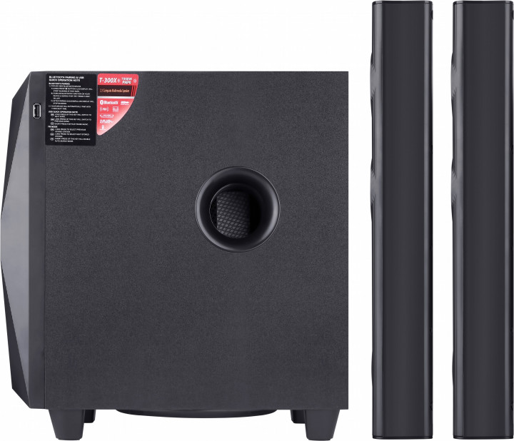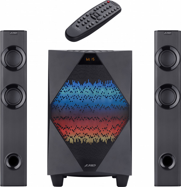 Audio System F&D T-300X Подключение Проводное, Беспроводное Совместимость ПК, Ноутбуки Питание От сети Входы AUX (1/8") Интерфейсы USB USB Беспроводные возможности Bluetooth Светодиодная подсветка С FM тюнером Мощность, Вт 70 Количество акустических каналов 2.1 Материал МДФ