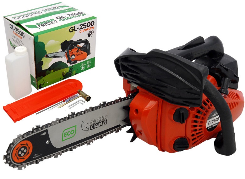 Бензопила цепная 900W GL2500 GreenLand Компактная универсальная бензопила GL2500 GreenLand, идеальное средство ухода за деревьями. Отличается удачным сочетанием мощности, легкости конструкции и удобством использования. Бензиновая цепная пила GL2500 GreenLand предназначена для подрезки сухих веток фруктовых, лиственничных и хвойных деревьев и кустарников, а так же для распиловки стволов деревьев диаметром не более 10-20 сантиметров. Небольшой вес, экономичный двигатель, передовая система антивибрации и сбалансированная конструкция позволят сделать точный распил без особых физических усилий. Пила оборудована автоматической системой смазки цепи, которая не даст перегреться рабочим частям пилы и предохранит их от преждевременного износа и коррозии. Производитель GreenLand Вес (Kg) 3.7 Емкость бака (ml) 360 Длина шины (mm) 250 Тип двигателя (timpi) 2T Емкость масляного бака (ml) 180 Мощность в лошадиных силах (HP) 1.5 Мощность двигателя (W) 900 Рабочий объем (cm?) 25