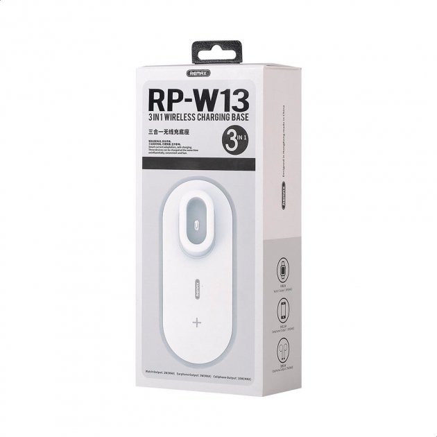 "Wireless Charger Remax. 3 in 1, RP-W13 INPUT: 5V/2A, OUTPUT: 5V/1A, Transmission distance ?6mm, charge efficiency: ?70%, Power rating : 5W, support all models with QI wireless standard White"