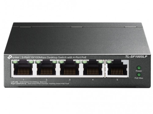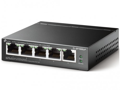 .5-port 10/100M TP-LINK PoE Switch, TL-SF1005LP, with 4 Port PoE, 41W Budget, steel case 5 портов RJ45 10/100 Мбит/с 4 порта PoE для передачи данных и подачи питания по одному кабелю Работает с питаемыми устройствами стандарта IEEE 802.3af