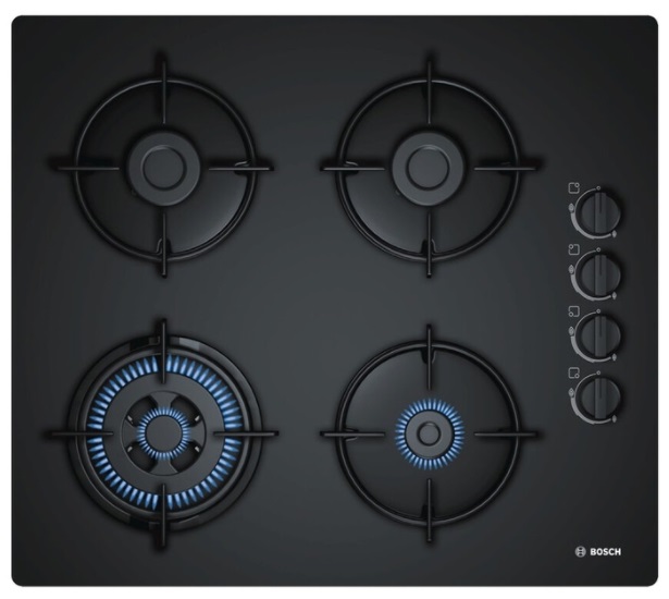 Варочная панель Bosch POH6B6B10 материал панели: закаленное стекло количество конфорок: 4 установка: независимая электроподжиг: есть газ-контроль: есть переключатели: поворотные ШхГ: 59х52 см