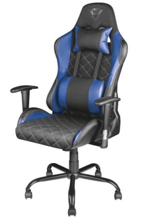 Trust Gaming Chair GXT 707B Resto - Blue, Height adjustable armrests, Class 4 gas lift, 90°-180° adjustable backrest, Strong and robust metal base frame, Including removable and adjustable lumbar and neck cushion, Durable double wheels, up to 150kg Материал обивки Экокожа Основание Крестовина с роликами Материал корпуса Металл, Пластик Страна регистрации бренда Нидерланды