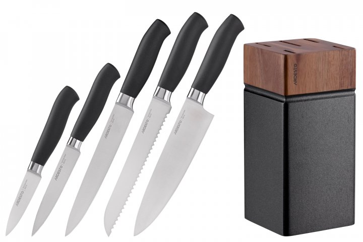 Набор ножей Ardesto Black Mars 6 пр., нержавеющая сталь, деревяный блок Материал лезвий Нержавеющая сталь Материал подставки/планки Дерево Материал рукояток Нержавеющая сталь