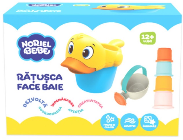 Noriel Bebe - Ratusca Face Baie Virsta: 0 - 3 ani Pentru: Ambisex Noriel Bebe "Ratusca face baie" Mac, mac, mac, esti gata pentru baita? Ratusca ta preferata este si ea gata sa te ajute la clatirea parului dupa samponare. S-a terminat cu spuma in ochi! Iar cat timp ea isi face treaba, tu te poti juca cu accesoriile incluse: stropitoarea si paharele cu fund perforat. De acum, baita va fi o bucurie! Varsta recomandata: 12 luni + Возраст: 0 - 3 года Для: Всех Нориэль Бебе "Утенок принимает ванну" Ваш любимый утенок готов принять ванну. И пока выполняет свою работу, вы можете играть с прилагающимися аксессуарами: разбрызгивателем и стаканами. Отныне Баня будет - радость! Рекомендуемый возраст: 12 месяцев +
