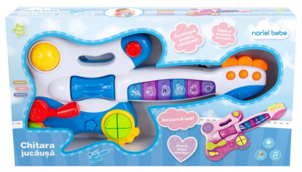 Noriel Bebe - Chitara Jucausa Возраст: 0 - 3 года Для: Всех Нориэль Бебе "Игривая гитара" Игривая гитара будет сопровождать вас в ваших музыкальных приключениях! С прекрасным дизайном, множеством кнопок, звуков и песен, он станет идеальным другом маленькой певицы! Работает от 3 батареек АА 1,5 В (не входят в комплект). Рекомендуемый возраст: 18 месяцев + Virsta: 0 - 3 ani Pentru: Ambisex Noriel Bebe "Chitara Jucausa" Chitara jucausa te acompaniaza in aventurile tale muzicale! Cu un design incantator, o multime de butoane, sunete si melodii, e prietenul ideal al micului cantaret! Functioneaza cu 3 baterii tip AA de 1,5V (nu sunt incluse). Varsta recomandata: 18 luni +