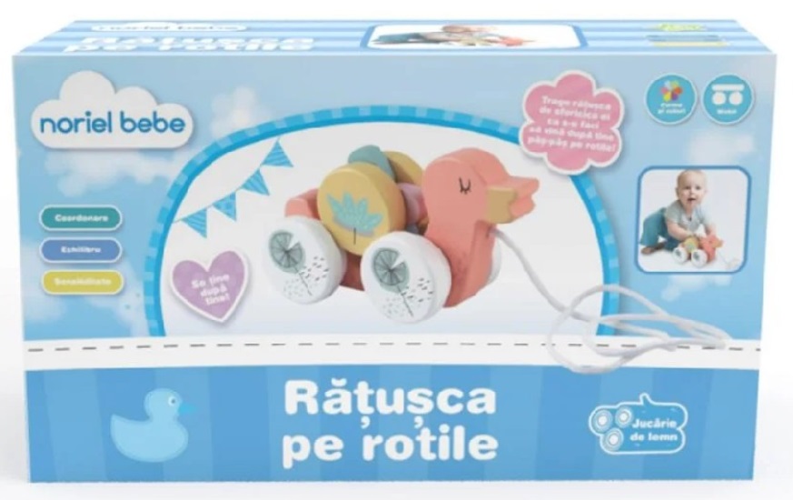 Noriel INT4586 Noriel Bebe - Ratusca Pe Rotile Возраст: 2+ Для: Всех Потяните уточку за ниточку, чтобы она шаг за шагом следовала за вами на колёсиках! Деревянная уточка с декорированными колесами, ярким цветком и красивой ниточкой следует за вами, куда бы вы ни пошли! Она способствует развитию следующих навыков: координации, баланса, подвижности. Рекомендуемый возраст: от 18 месяцев Virsta: 2+ Pentru: Ambisex Trage ra?u?ca de sforicica ei ca s-o faci sa vina dupa tine pas cu pas pe rotile! Cu ro?i decorate, o floare colorata ?i o sforicica numai buna de tras, ra?u?ca de lemn te urmeaza oriunde te-ai duce! Incurajeaza dezvoltarea urmatoarelor abilita?i: coordonare, echilibru, mobilitate. Varsta recomandata: 18 luni+.