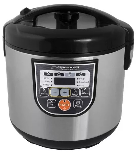 Multifierbator Esperanza Cooking Mate EKG011 Бренд ESPERANZA Модель COOKING MATE EKG011 Тип Мультиварка Мощность 860 Вт Объем 5 л Материал корпуса Пластик / Нержавеющая сталь Внутреннее покрытие Антипригарное Управление Электронное Разогрев 3D Есть Количество программ 11 Автоматические программы Приготовление первых блюд, каши, риса, плова, приготовление на пару, тушение, жарка, йогурт, паста, творог, таймер отсрочки Таймер Есть Поддержание температуры Есть