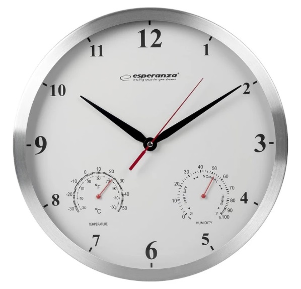 Ceas de perete Esperanza Washington EHC008W white, 30 cm Тип механизма кварцевый Корпус алюминий Цвет корпуса серебристый Индикация арабские цифры Термометр да Гигрометр да Габариты 300x300x37 мм Питание 1xAA Производитель Esperanza