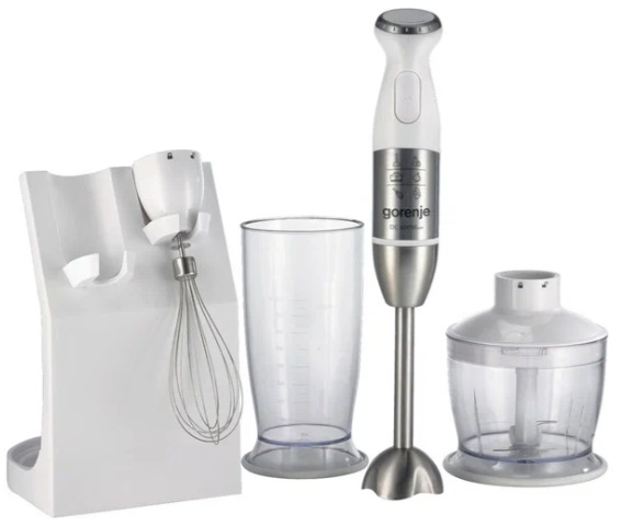Blender Gorenje HBC806QW Максимальная мощность 800 Вт Материал кувшина пластик Материал корпуса металл/пластик Материал погружной части металл Количество скоростей 1 Управление механическое Насадки венчик для взбивания, для приготовления пюре, измельчитель, Насадка-блендер, Венчик, Измельчитель